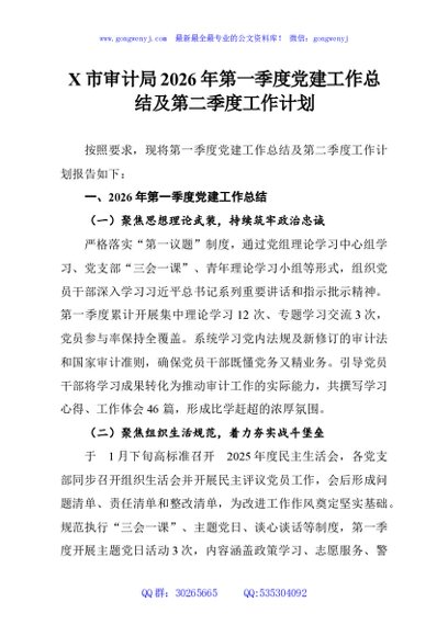 / X市审计局2026年第一季度党建工作总结及第二季度工作计划