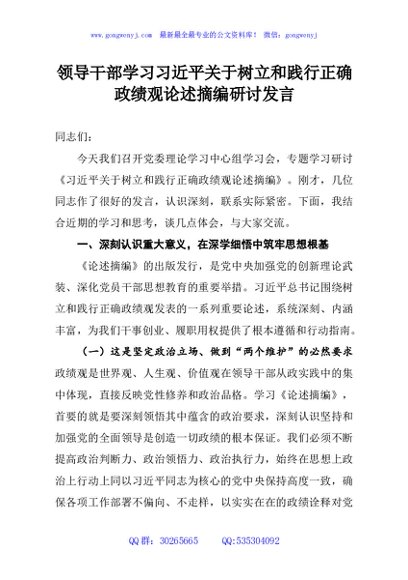 / 领导干部学习习近平关于树立和践行正确政绩观论述摘编研讨发言