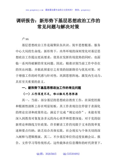 / 调研报告:新形势下基层思想政治工作的常见问题与解决对策