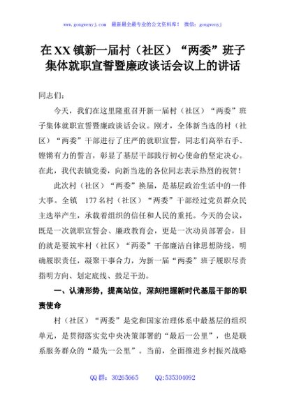 在XX镇新一届村(社区)“两委”班子集体就职宣誓暨廉政谈话会议上的讲话 - 公文研究
