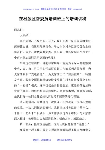 / 在村务监督委员培训班上的培训讲稿