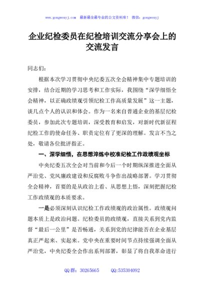 / 企业纪检委员在纪检培训交流分享会上的交流发言