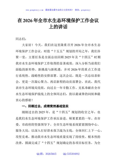 / 在2026年全市水生态环境保护工作会议上的讲话