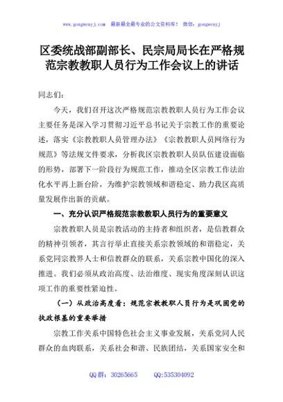 / 区委统战部副部长、民宗局局长在严格规范宗教教职人员行为工作会议上的讲话