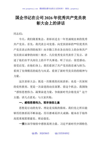 / 国企书记在公司2026年优秀共产党员表彰大会上的讲话