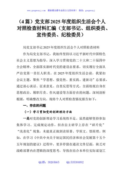 / (4篇)党支部2025年度组织生活会个人对照检查材料汇编(支部书记、组织委员、宣传委员、纪检委员)