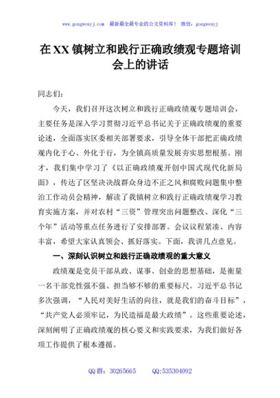 / 在XX镇树立和践行正确政绩观专题培训会上的讲话