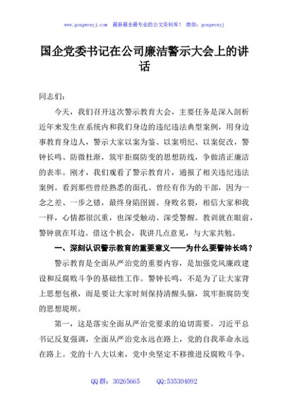 / 国企党委书记在公司廉洁警示大会上的讲话