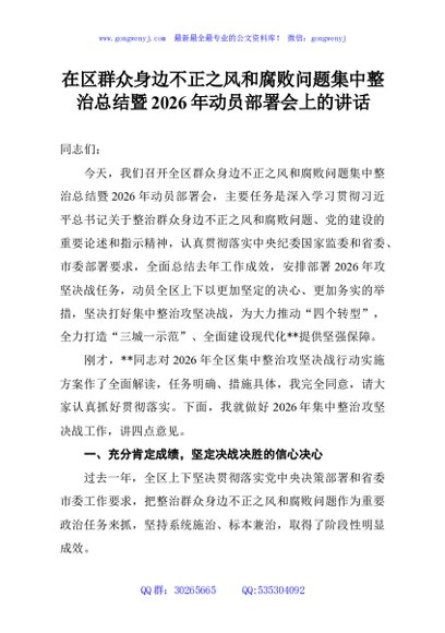 / 在区群众身边不正之风和腐败问题集中整治总结暨2026年动员部署会上的讲话