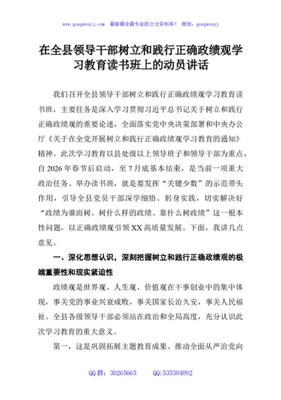 / 在全县领导干部树立和践行正确政绩观学习教育读书班上的动员讲话