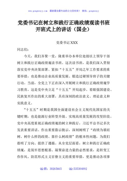 / 党委书记在树立和践行正确政绩观读书班开班式上的讲话(国企)
