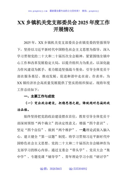 / XX乡镇机关党支部委员会2025年度工作开展情况