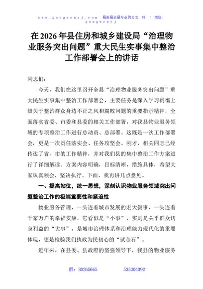 / 在2026年县住房和城乡建设局“治理物业服务突出问题”重大民生实事集中整治工作部署会上的讲话