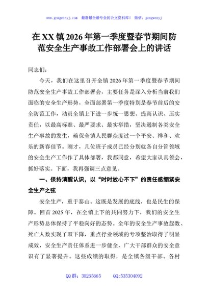 / 在XX镇2026年第一季度暨春节期间防范安全生产事故工作部署会上的讲话