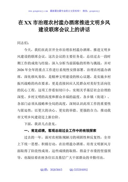 / 在XX市治理农村滥办酒席推进文明乡风建设联席会议上的讲话