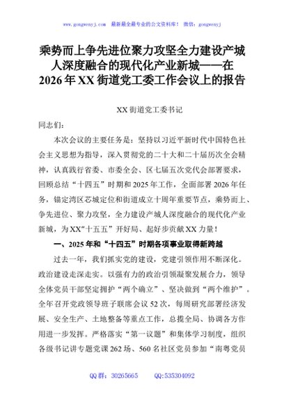 / 乘势而上争先进位聚力攻坚全力建设产城人深度融合的现代化产业新城——在2026年XX街道党工委工作会议上的报告