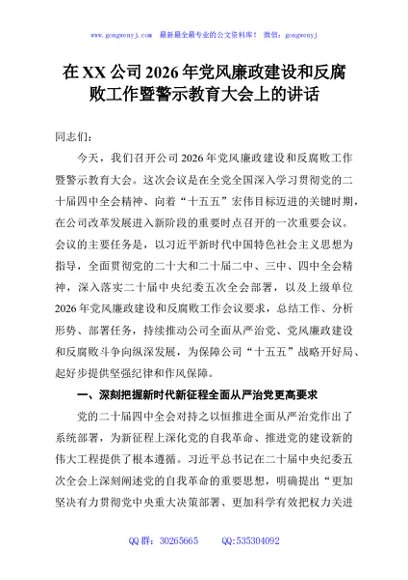 / 在XX公司2026年党风廉政建设和反腐败工作暨警示教育大会上的讲话