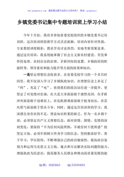 乡镇党委书记集中专题培训班上学习小结