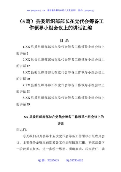 / (5篇)县委组织部部长在党代会筹备工作领导小组会议上的讲话汇编