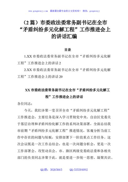 / (2篇)市委政法委常务副书记在全市“矛盾纠纷多元化解工程”工作推进会上的讲话汇编