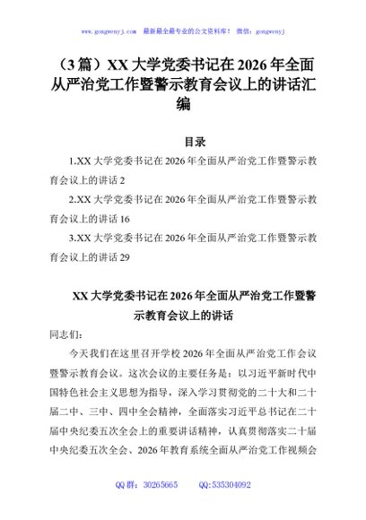 / (3篇)XX大学党委书记在2026年全面从严治党工作暨警示教育会议上的讲话汇编