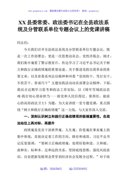 / XX县委常委、政法委书记在全县政法系统及分管联系单位专题会议上的党课讲稿