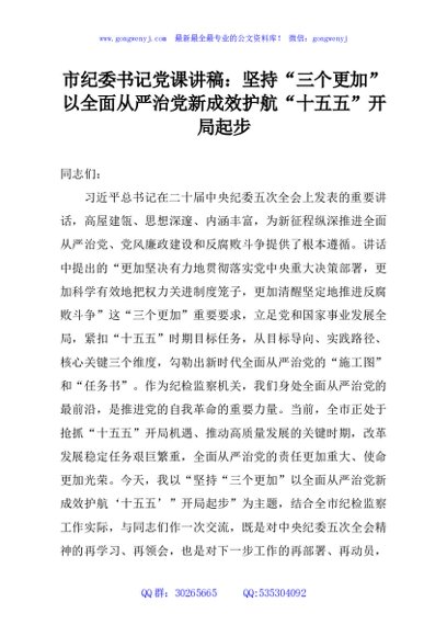 / 市纪委书记党课讲稿:坚持“三个更加”以全面从严治党新成效护航“十五五”开局起步