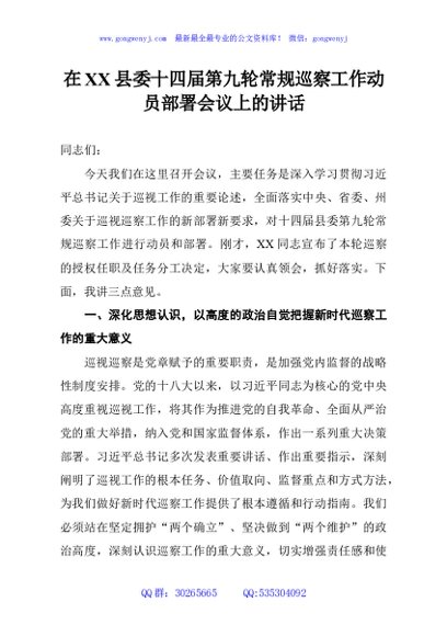 / 在XX县委十四届第九轮常规巡察工作动员部署会议上的讲话