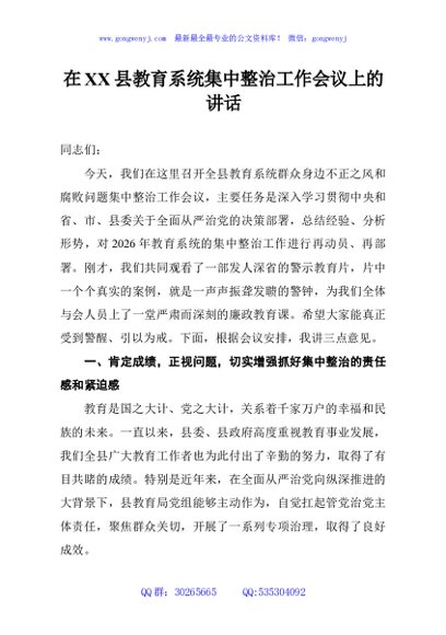 / 在XX县教育系统集中整治工作会议上的讲话