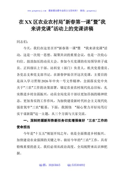 / 在XX区农业农村局新春第一课暨我来讲党课活动上的党课讲稿