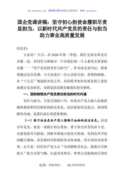 / 国企党课讲稿:坚守初心担使命履职尽责显担当,以新时代共产党员的责任与担当助力事业高质量发展