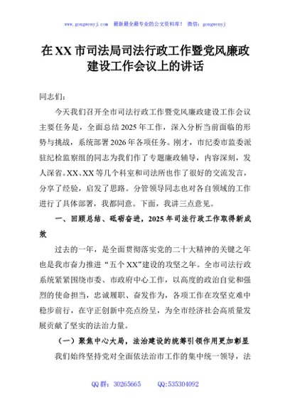 / 在XX市司法局司法行政工作暨党风廉政建设工作会议上的讲话