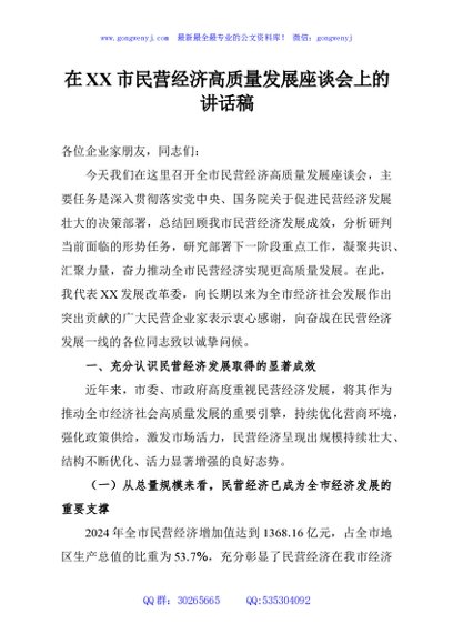 / 在XX市民营经济高质量发展座谈会上的讲话稿
