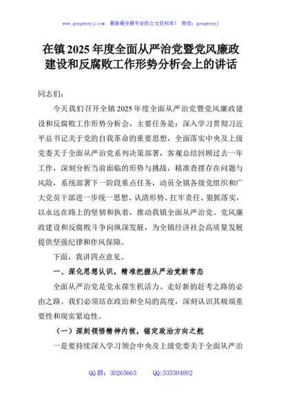 / 在镇2025年度全面从严治党暨党风廉政建设和反腐败工作形势分析会上的讲话