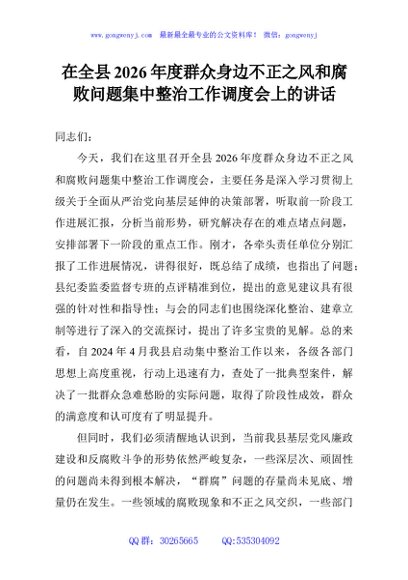 / 在全县2026年度群众身边不正之风和腐败问题集中整治工作调度会上的讲话