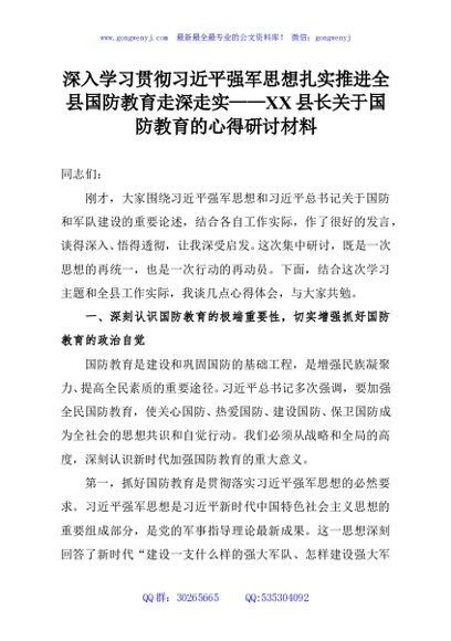 / 深入学习贯彻习近平强军思想扎实推进全县国防教育走深走实——XX县长关于国防教育的心得研讨材料