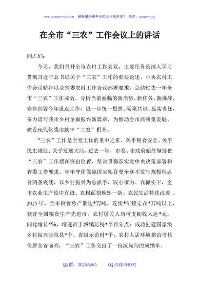 / 在全市“三农”工作会议上的讲话