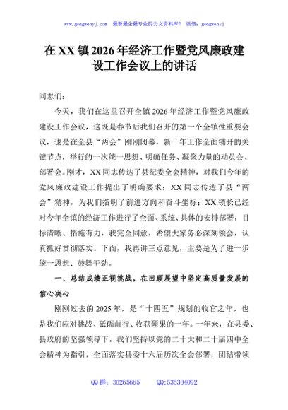 / 在XX镇2026年经济工作暨党风廉政建设工作会议上的讲话
