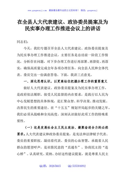 / 在全县人大代表建议、政协委员提案及为民实事办理工作推进会议上的讲话