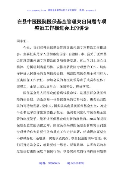/ 在县中医医院医保基金管理突出问题专项整治工作推进会上的讲话