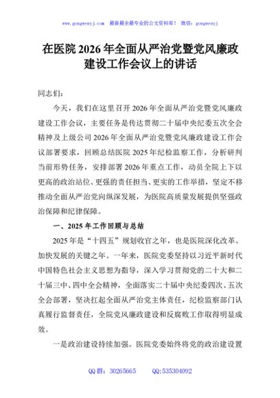 / 在医院2026年全面从严治党暨党风廉政建设工作会议上的讲话