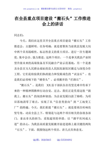 / 在全县重点项目建设“搬石头”工作推进会上的讲话