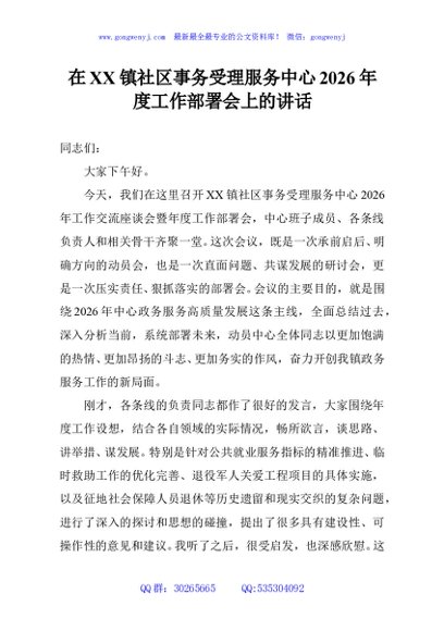 / 在XX镇社区事务受理服务中心2026年度工作部署会上的讲话