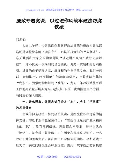 / 廉政专题党课:以过硬作风筑牢政法防腐铁壁