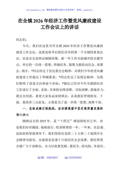 / 在全镇2026年经济工作暨党风廉政建设工作会议上的讲话