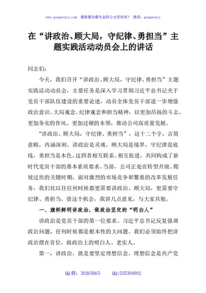 / 在“讲政治、顾大局,守纪律、勇担当”主题实践活动动员会上的讲话