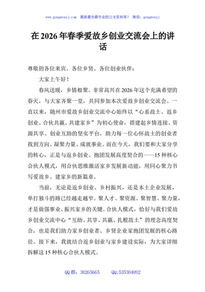 / 在2026年春季爱故乡创业交流会上的讲话