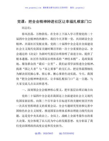 党课:把四中全会精神种进社区让幸福扎根家门口