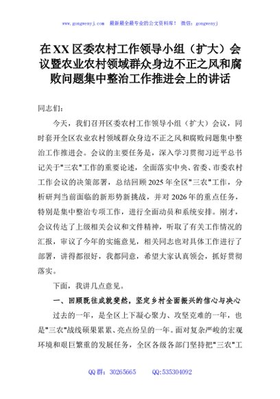 / 在XX区委农村工作领导小组(扩大)会议暨农业农村领域群众身边不正之风和腐败问题集中整治工作推进会上的讲话