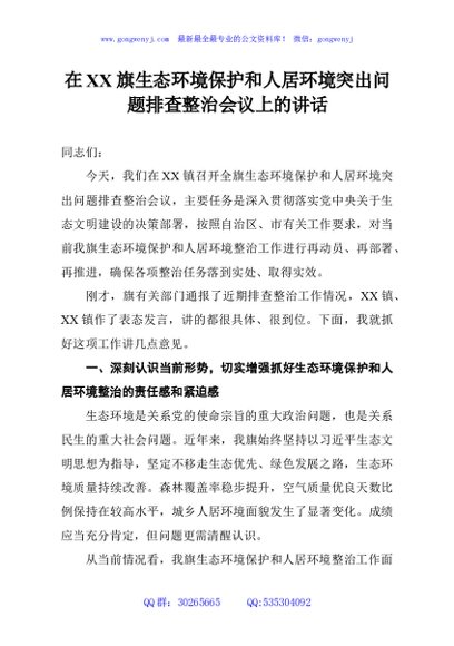 / 在旗生态环境保护和人居环境突出问题排查整治会议上的讲话